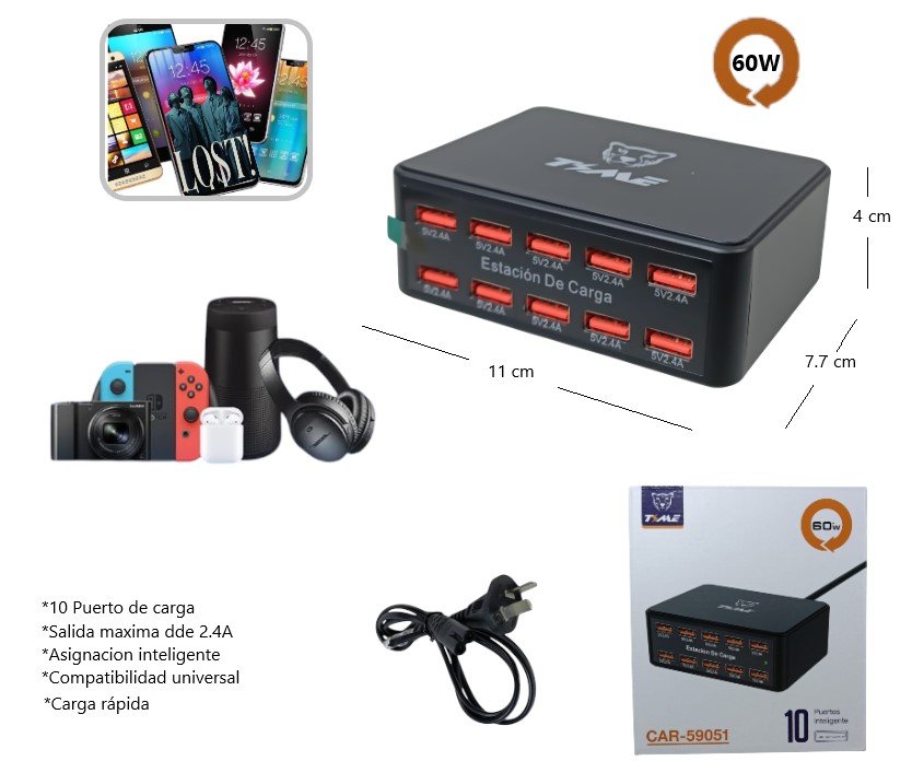 ESTACION DE CARGA 10 PUERTOS USB TOTAL 60W CAR-59051
